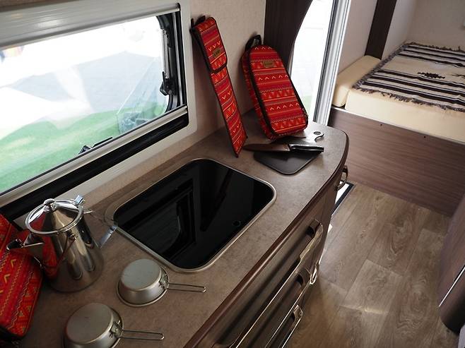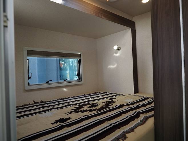 싱크대 주변엔 요리할 수 있는 공간과 작은 냉장고, 그리고 여러 수납함이 자리했다. 냉장고 위와 싱크대 아래까지 ‘뭐 이리 수납함이 많나?’ 싶겠지만, 트렁크가 따로 없는 캠핑카로서는 이 정도는 마련해야 남은 실내를 말끔히 쓸 수 있다. 그런데 급하게 살펴봤을 때 전기 렌지는 찾을 수 없었다.