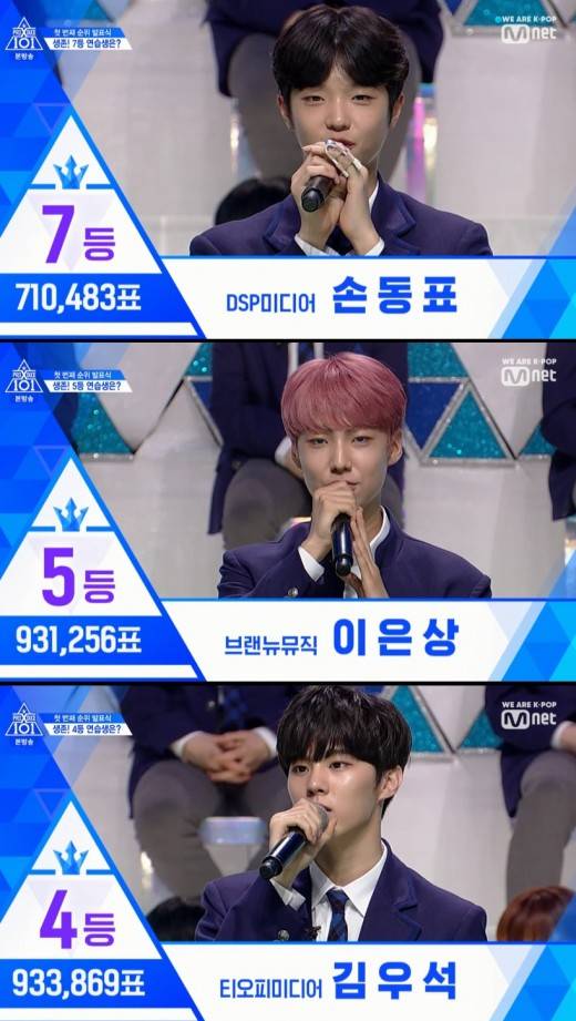 최연소 연습생 남도현이 6위를 차지한 가운데 ‘_지마’의 센터 손동표는 7위에 올랐다. 흥미로운 점은 시즌2 ‘나야나’의 센터 이대휘 역시 첫 순위발표식에서 7위를 차지했다는 것이다.