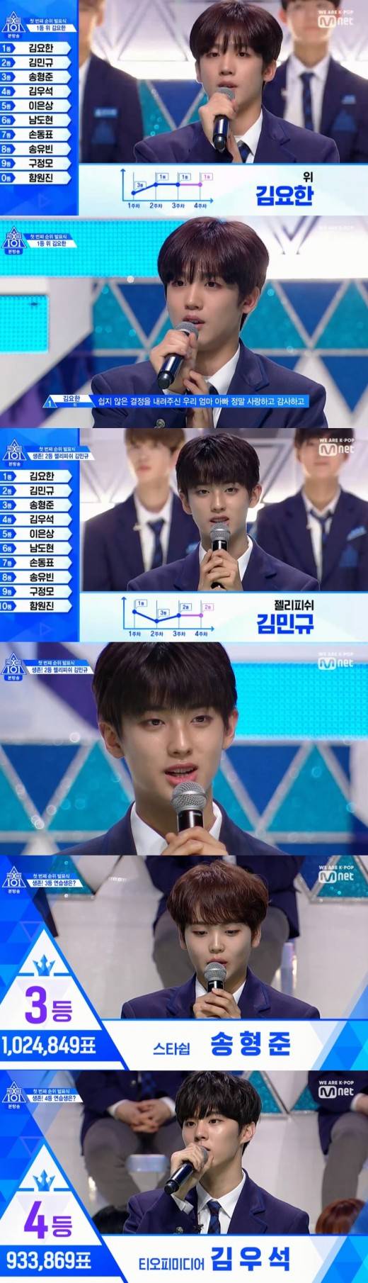 1위의 영예는 김요한이 안았다. 김요한은 2주차 3주차 투표 1위를 차지한데 이어 첫 순위발표식의 위너로 우뚝 서며 기쁨을 누렸다.