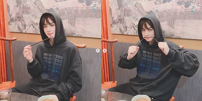 공개된 사진 속 차은우는 한 식당에서 검정색 후드티셔츠를 입고 젓가락을 든 채 장난스러운 포즈를 취했다.