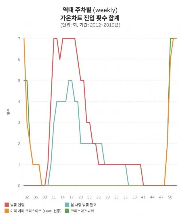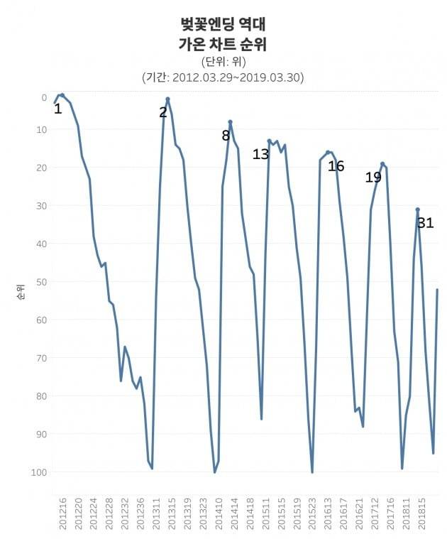 엔딩은 매년 2월 마지막 주부터 5월 첫째 주까지 랭킹 진입 횟수가 점점 오릅니다. 이후 벚꽃이 모두 진 5월부터 서서히 감소합니다. 여름이 끝날 무렵인 41주차부터는 차트에서 찾아볼 수 없습니다.