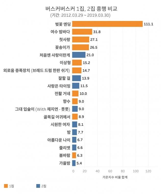 장범준은 또한 "'벚꽃엔딩'이 워낙 잘 돼서 부담스럽기도 하다"라고 털어놨습니다. 실제로 1집 이후 2013년 9월, '가을' 컨셉의 2집을 발표했지만 1집만큼 큰 성공을 거두지는 못했습니다. 가온차트에 나타난 가온지수 예측치와 차트 진입 횟수를 비교하면 2집이 1집에 크게 못미치는 사실을 알 수 있습니다. 장범준의 가장 큰 라이벌이 바로 자기자신인 셈입니다.