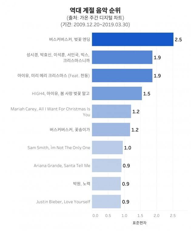 10년 동안 각 주차별로 차트진입 횟수를 집계한 뒤 표준편차를 계산했습니다. 편차가 높으면 그만큼 차트에 진입한 횟수가 들쭉날쭉하다는 뜻입니다. 안 듣는 기간과 많이 듣는 기간의 차이가 심한 곡은 편차가 크게 계산됩니다. 꾸준히 많이 소비되는 음악보다 특정 시기에 유난히 많이 소비되는 음악 순위를 알 수 있죠. 봄에 자주 듣는 음악, 크리스마스에 자주 듣는 음악 등을 쉽게 추려낼 수 있단 뜻입니다.