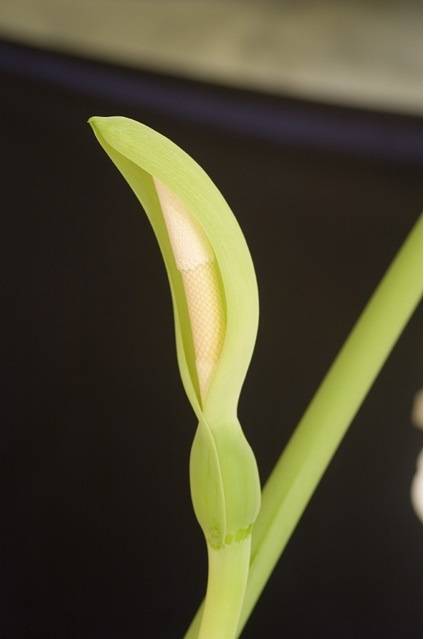 | ▲ 알로카시아 꽃 알로카시아 꽃을 처음에 보면 별 이상하게 생긴 꽃이 다 있구나 싶다. 별로 예쁘지도 않고 낯설다. 그래도 자세히 보면 유려한 곡선 모양의 포와 작은 꽃방망이가 신비롭다. 꽃방망이 윗부분이 수꽃이고, 아래쪽 부분이 암꽃이다. 시들면 초콜릿 색으로 변한다. |