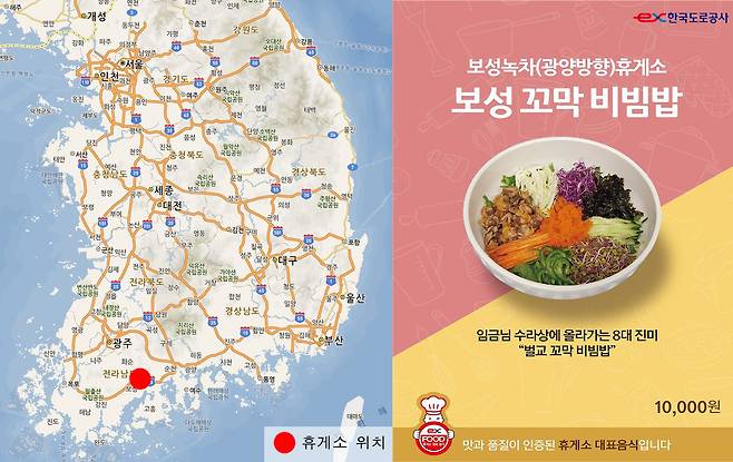 이서휴게소(순천 방향) 명품 꼬막 비빔밥 – 비빔밥 핵심은 밥이다. 맛있는 밥을 위해 이서휴게소에서는 직접 도정기를 설치해 정미소를 차렸다. 이 맛있는 밥을 바탕으로 꼬막과 삶은 달걀, 날치알, 다양한 채소를 곁들였다. 그리고 비법 한 가지 더. 일반 고추장이 아닌 유자청 고추장을 넣는다. 가격은 1만 원.