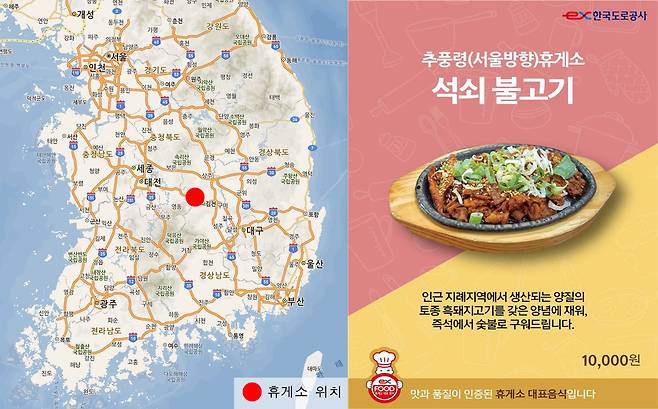 추풍령휴게소(서울방향) 석쇠 불고기 – 서울로 다시 돌아오는 길, 우리나라 최초 휴게소인 추풍령 휴게소에 들러야 한다. 한국도로공사 EX-FOOD 협회장상을 받은 석쇠 불고기가 있기 때문. 경북 김천 지례면 특산 토종 흑돼지고기를 맛볼 수 있다. 대체로 숯불 향이 진하다는 평가다. 값은 1만 원.