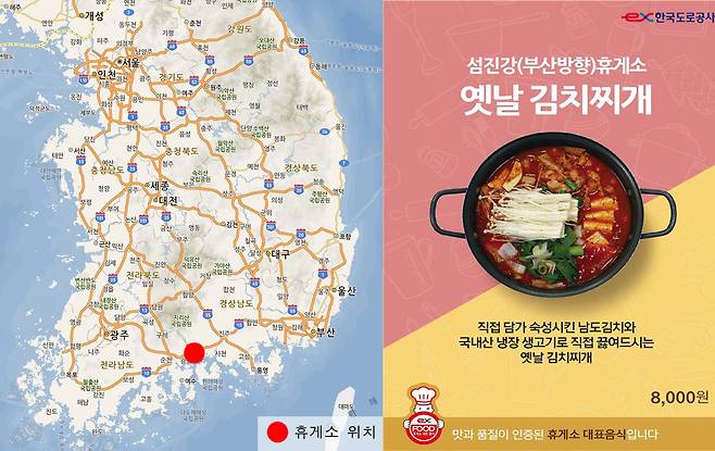 섬진강휴게소(부산 방향) 옛날 김치찌개 – 휴게소는 구조상 음식이 간편하기 마련이다. 그런데 섬진강 휴게소에서는 불 위에 올려놓고 팔팔 끓여 먹는 김치찌개를 준비했다. 남도 담금 김치와 함께 국산 냉장 생고기를 사용해 맛을 낸다. 물론 불 앞에 두기 때문에 라면 사리를 따로 추가할 수 있다. 한국도로공사 EX-FOOD 우수상을 받았다. 값은 8,000원