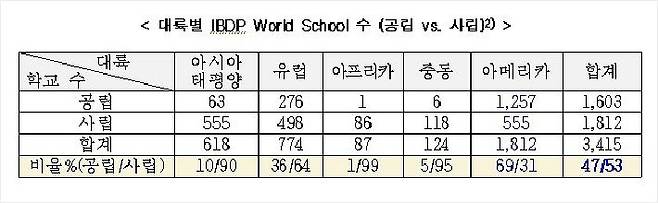 그러나 2019년 3월 현재 IBO 홈페이지에 제시된 IBDP 운영 학교 3,395교 중 47%(1,603)가 공립이고 사립이 53%(1,792)입니다. 영국, 캐나다, 미국의 경우 국제학교보다는 일반사립학교가 대부분입니다.