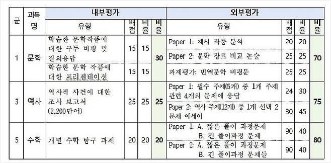 과목별 내부평가와 외부평가 항목 및 비율은 각기 다르며 이에 대한 구체적인 내용은 과목별 guide에 제시됩니다.