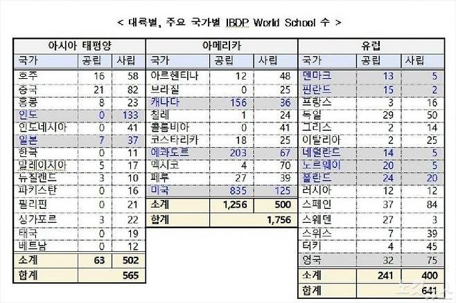 ❍ 주목할 곳은 미대륙입니다. IBDP 운영 학교의 50% 이상이 미대륙에 분포하고 있습니다. 특히 미국이 전체 DP학교의 25% 정도(960교)를 가지고 있으며, 이 중 87%가 공립학교에 있습니다(공립 835교, 사립 125교). 미국은 국제공인 과정인 AP(Advance Plancement)를 실시하고 있는 나라이며, 우리나라를 비롯한 많은 나라에서 AP를 도입하고 있습니다. 그럼에도 미국의 공립학교가 IB를 도입하고 있다는 사실에 주목할 필요가 있습니다.