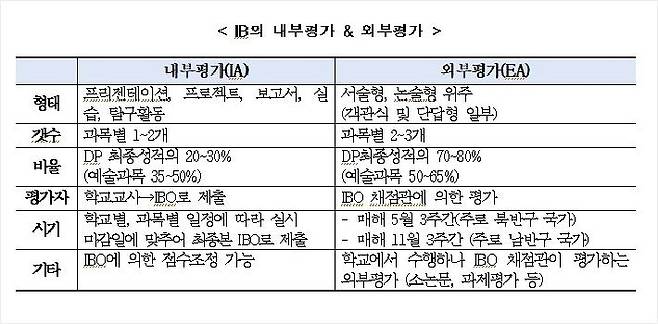 그러나 IB 학교에 근무했던 교사들은 모두 일관되게 IBDP는 사교육이 필요 없다고 합니다. 내부평가를 교사가 하지만, 이 평가 기준은 IBO에서 제공하고 있습니다. 교사는 평가 기준에 따라 엄격하고 공정하게 평가해야 합니다. 교사가 준 내부평가 결과 일부를 IBO의 외부 채점관이 교차 채점하여 교사가 준 점수가 IBO의 기준에 부합하지 않거나 공정성이 결여되었다고 판단되면 점수를 변경할 것을 요청합니다.