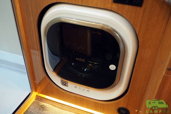 하지만 이 작은 주방에는 두 가지의 반전이 숨어 있다. 그 중 하나는 하부에 설치된 ‘미니 드럼세탁기’다. 가정집의 빌트-인 드럼세탁기를 축소시켜 놓은 듯한 앙증맞은 세탁기 덕분에 아웃도어 활동 중 생기는 소량의 빨래를 그 자리에서 손쉽게 해결할 수 있다. 수영복이나 스포츠 타월, 티셔츠 등과 같이 부피는 작지만 사용 후 신속하게 빨래를 해줘야 할 필요가 있는 것들을 세탁할 때 용이하다.