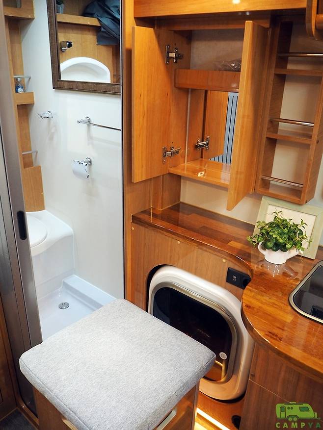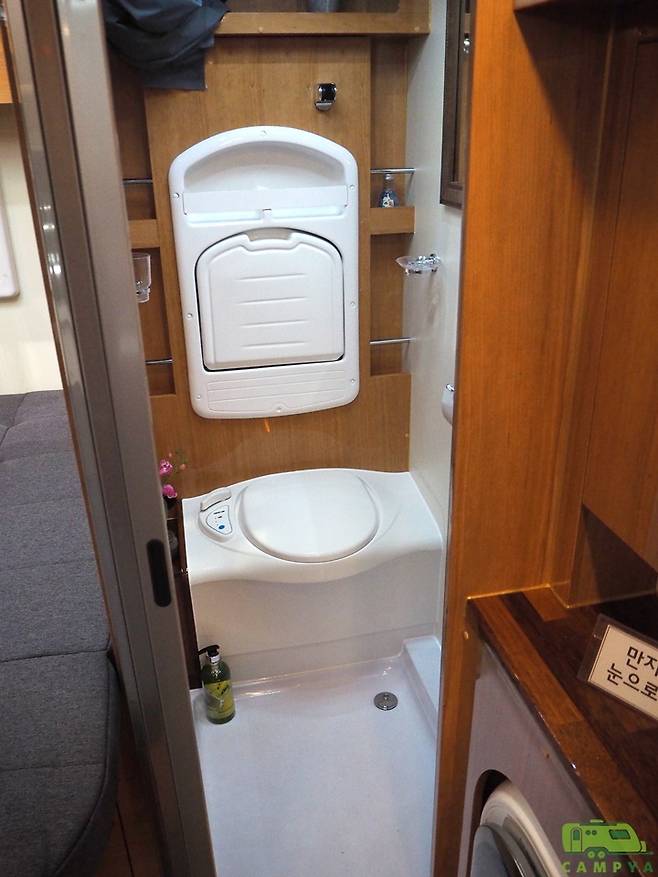 화장실 겸 욕실의 출입문은 국내 캠핑카 중 최초로 유럽식의 탬버도어를 채용했다. 탬버도어는 좌우로 여닫는 셔터 형태의 도어로, 일반적인 목제 여닫이 문에 비해 우수한 수밀성과 출입문으로 인한 공간의 낭비 및 간섭을 최소화할 수 있다는 장점을 갖는다. 화장실 겸 욕실 내부는 욕조형 바닥구조와 함께 고정형 변기와 접이식 세면대, 샤워기 겸용 수전, 상부 수납공간 등으로 구성되어 있다.