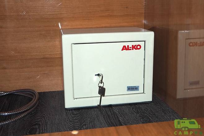 새로운 시도는 침대 아래에도 숨어 있다. 일반적인 카라반이나 모터홈에서 볼 수 있는 침대 하부의 수납공간에 대한 이야기가 아니다. 실크로드 640SR의 침대 아래에는 국내 캠핑카 최초로 ‘금고’가 설치되어 있기 때문이다. 실크로드 640SR에 채용된 금고는 독일 AL-KO의 RV전용 금고로, 가정에 비해 취약할 수 밖에 없는 캠핑카의 보안 문제를 어느 정도 보완해 주는 역할을 한다. 금고는 차량 내부에서만 접근할 수 있으며, 외부 서비스 도어로는 접근이 불가능하다. 금고는 지갑이나 시계 등의 귀중품을 보관하는 데 알맞은 크기다.