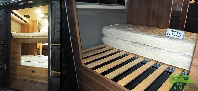 블루버드 스프린터의 침대는 전방의 소파 변환 침대와 후방의 2인용 2층 침대로 구성되어 있다. 이를 통해 총 6명을 수용할 수 있다. 2층 침대는 주방 측에 마련된 접이식 사다리를 이용하여 접근할 수 있다. 2층 침대는 고정형이 아닌, 가변형이다. 매트리스를 반으로 접고 침대 구조물을 안쪽으로 밀어내면 넉넉한 크기의 수납공간이 조성된다. 이 공간은 이동시에 트렁크 공간으로 활용할 수 있다. 하지만 침대 자체의 크기는 다소 작은 편이다. 침대 매트리스의 크기는 1층과 2층이 각각 다르다. 1층은 길이 1,725mm, 폭 1,182mm이며, 2층은 1,570mm, 폭 1,182mm다. 2층은 어린이가 사용하기에 적합하고 1층은 체격이 작은 성인 여성에게 적당하다.