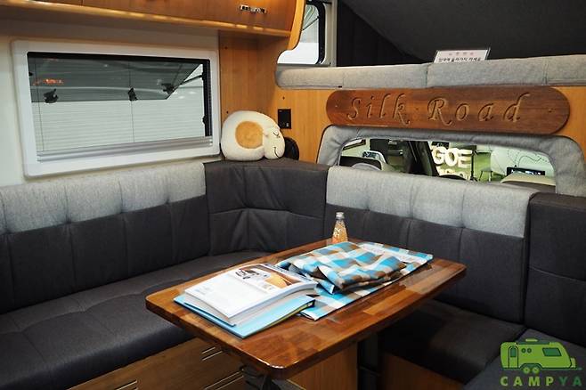 실크로드 640SR의 진가는 실내, 그리고 평면구성에서 드러난다. 실내를 구성하고 있는 가구들은 이탈리아산 포플러 합판과 체리 무늬목으로 꾸며져 있으며, 고광택 표면처리로 마감되어 있다. 출입문을 기준으로 차체 전면 방향은 2명의 성인이 취침할 수 있는 벙커베드와 U자형 소파를 채용한 거실 구역으로 구성되어 있다. 이러한 구성은 다른 캠핑카 제작사에서도 이미 사용하고 있는 방식이다. 특이한 점으로는 소파 쿠션과 매트리스의 외피, 벙커베드 구역 내부 등에 직물 마감재를 사용한 것이다. 대부분의 캠핑카들이 사용하고 있는 인조가죽과는 색다른 분위기와 질감을 제공한다.