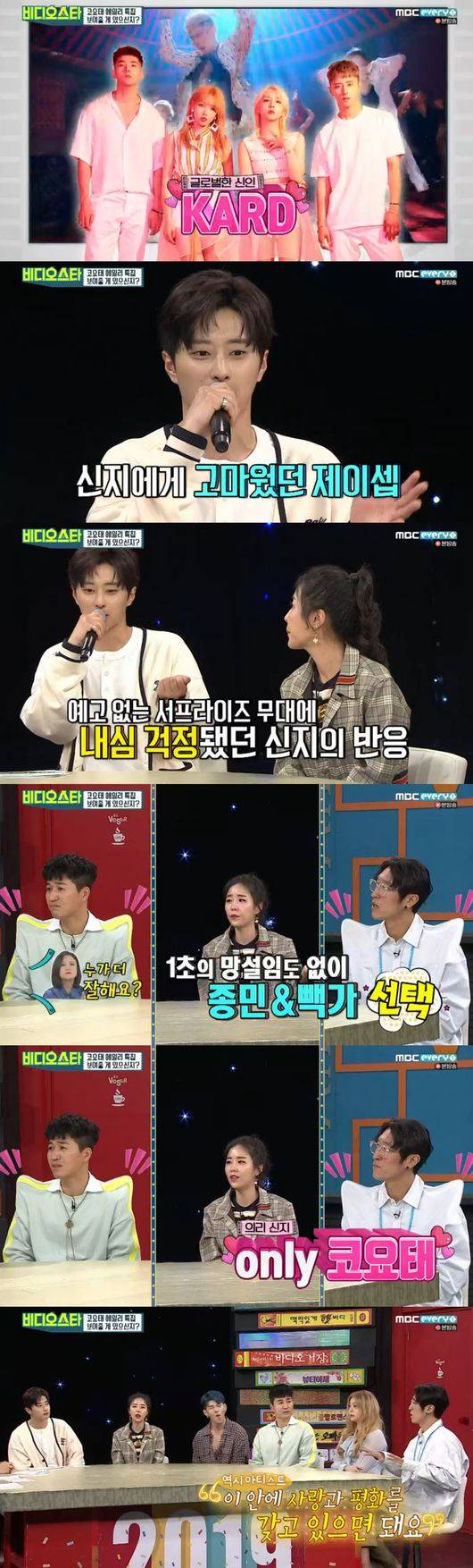 MC들은 신지에게 KARD와 종민, 빽가 중 누구를 고를 것인지 질문, 신지는 고민없이 코요태를 선택했다. 그러면서 후배 혼성그룹 KARD에게 "참지말고 싸워라, 잘 싸우고 잘 풀어야 오래가, 쌓아놨다가 터지면 겉잡을 수 없다"면서 "사내연지 금지, 돈관계는 철저하게 그럼 오래갈 수 밖에 없다"고 했다.