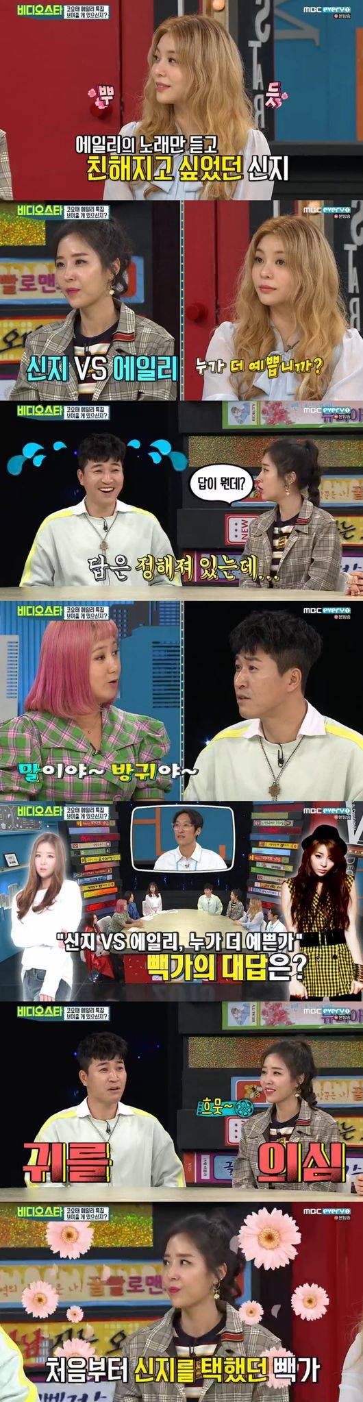김종민에게 신지와 에일리 중 누가 더 예쁜지 질문, 김종민은 "에일리가 예쁘다, 신지는 가족"이라면서 에일리의 얼굴이 가장 예쁘다며 에일리 바라기 모습을 보였다. 빽가는 신지 선택, 신지는 "빽가가 내 민낯을 좋아한다"고 말해 웃음을 안겼다. 가창력에 대해서도 빽가는 신지를 선택, 그러면서 "신지 목소리를 좋아한다, 연륜이 생기고 삶의 애환들이 쌓이면서 신지 목소리의 감성이 좋더라"며 이유를 전했다. 김종민도 공감했으나 또 에일리를 뽑아 반전 모습이 웃음을 안겼다.