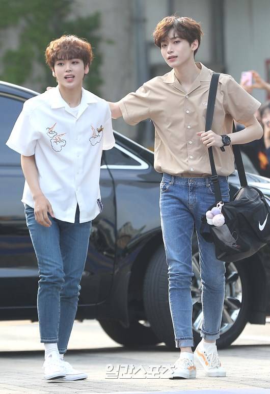 송형준, 구정모가 30일 오전 인천 부평구 삼산동 인천삼산월드체육관에서 열린 Mnet ‘프로듀스X101’ 콘셉트 평가 녹화 전 진행된 블루카펫 세리머니에 참석해 포즈를 취하고 있다.