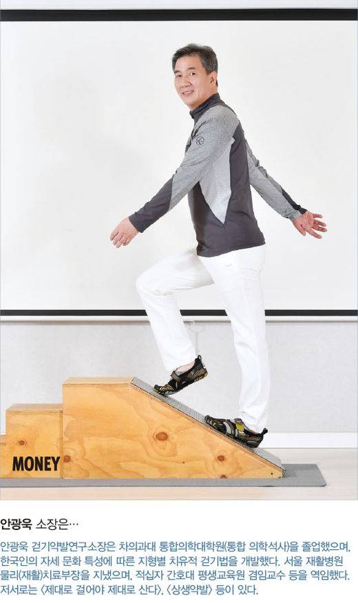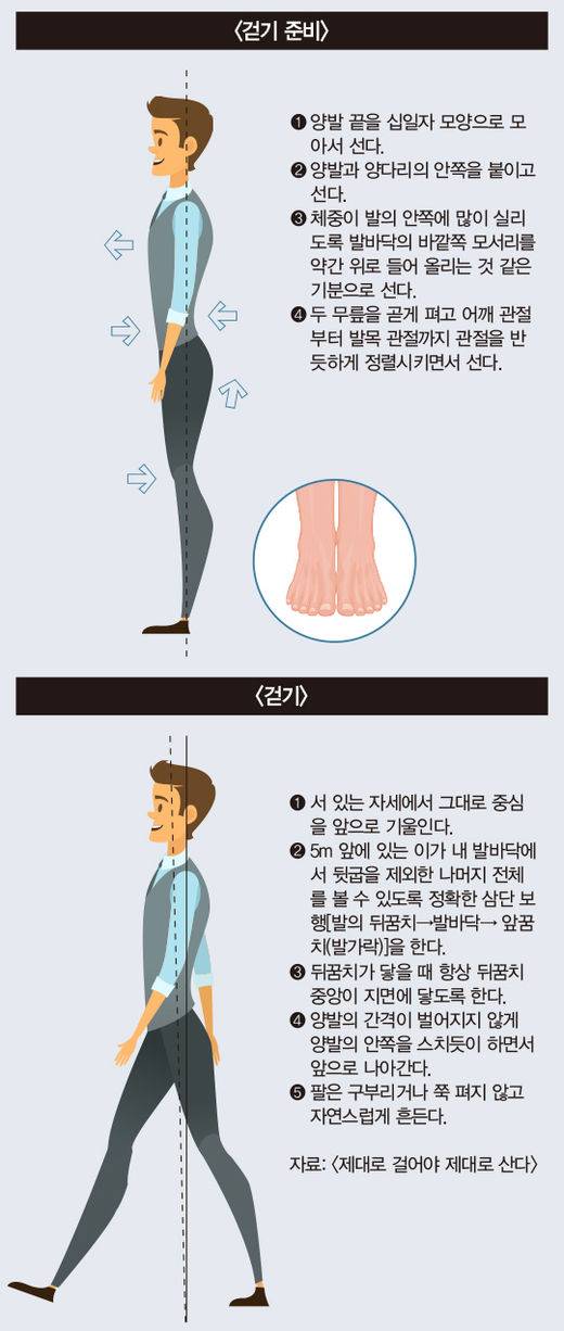 제대로 걷기 위해서는 서 있는 자세부터 바로잡아야 한다. 안 소장은 “서 있는 자세를 바로잡을 수 있다면 제대로 걷기의 반은 배운 셈이다”고 했다. 제대로 서 있기 자세의 이동이 바로 제대로 걷기이기 때문이다.