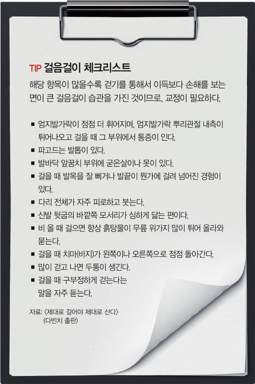 평생토록 걸어 다녔는데 중년에 이르러 ‘잘 걷는 법’을 배운다는 것은 새삼스럽지 않을 수 없다. 그렇다면 평소 제대로 걷고 있는지, 몸을 망치는 걷기를 하고 있는지 어떻게 판단할까.