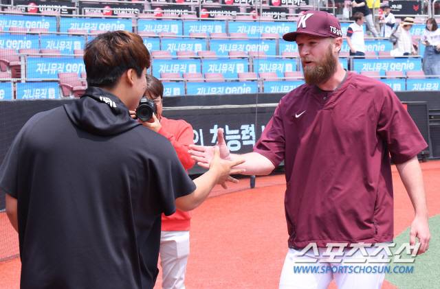 12일 수원 케이티위즈파크에서 KT 위즈와 키움 히어로즈의 경기가 열린다. 경기 전 키움 요키시가 KT 강백호를 찾아 사과하고 있다. 요키시는 전날 강백호의 머리를 맞춰 퇴장을 당했다. 밝은 표정으로 대화를 나누고 있는 요키시와 강백호. 수원=송정헌 기자 songs@sportschosun.com/2019.05.12/