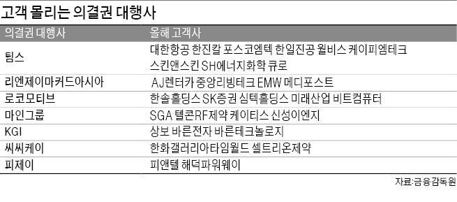 의결권 위임 대행사도 ‘주총 특수’를 누리고 있다. 전국 소액주주의 의결권 위임장을 대신 받아주는 의결권 모집 대행사들은 올해 정기 주총에서만 총 30억원 안팎의 매출을 올린 것으로 추정된다. 의결권 모집 대행사인 팀스는 이번 정기 주총에서 대한항공, 한진칼, 포스코엠텍을 비롯해 10여 개사의 의결권 모집 업무를 대행하고 있다. 리앤제이마커드아시아(AJ렌터카 중앙리빙테크 등), 씨씨케이(한화갤러리아타임월드 셀트리온제약 등), 로코모티브(한솔홀딩스 SK증권 등), 마인그룹(신성이엔지 케이티스 등) 등도 대기업을 고객사로 두고 의결권 모집 업무에 한창이다. 이들은 건당 3000만~1억5000만원가량의 비용을 요구한다.