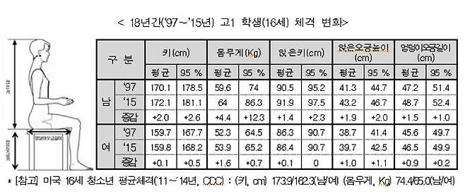 국가기술표준원이 1997년 시행한 제4차 인체치수조사와 2015년 제7차 조사 결과를 비교하면 고등학교 1학년 남학생의 키는 2cm 커졌고 체중은 4.4kg 늘었다. 특히 체중 상위 5% 학생은 1997년부터 2015년 사이 몸무게가 12.3kg 증가했다.
