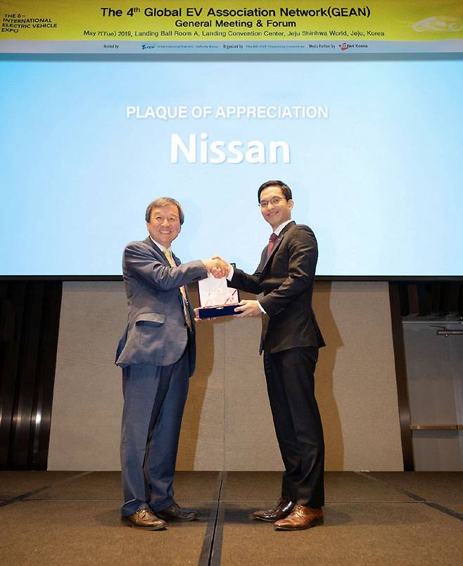 한국닛산㈜(대표: 허성중)은 오늘 제주신화월드 랜딩컨벤션홀에서 개최된 제4차 세계전기차협의회(GEAN) 총회에서 공로패를 수상했다고 밝혔다.