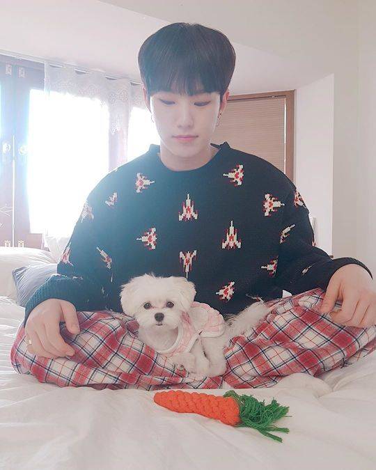 사진 속 호시는 니트를 입고 침대 위에서 부승관 반려견 부끄와 함께 앉아 있다. 호시는 햄스터 닮은 외모로 부끄와 앙증맞은 비주얼을 자랑했다.