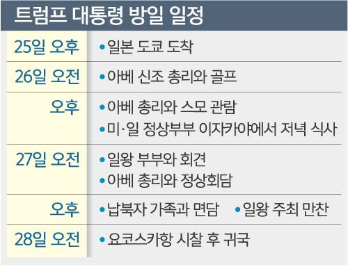 트럼프 대통령은 방일 사흘째인 27일 나루히토 일왕 부부와의 만남, 아베 총리와의 11번째 정상회담, 일왕 주최 만찬 등이 예정돼 있다. 미·일 관계를 강조하고 있는 정부와 대조적으로 왕실은 트럼프 대통령에게 특별 대우를 하지는 않을 계획이라고 도쿄신문은 전했다. 왕실 관계자는 “국가의 크고 작고와 관계없다. 트럼프 대통령에게도 지금까지의 다른 국빈과 마찬가지로 대우하겠다”고 말했다.