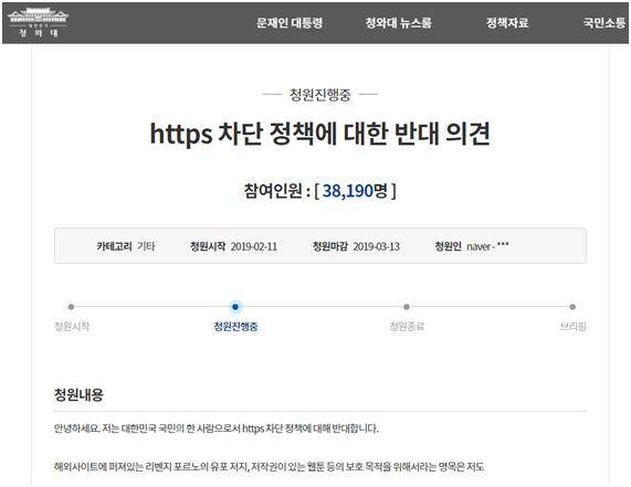 11일 KT망을 시작으로 성인동영상 사이트 등 불법 유해사이트 접속이 차단되자 네티즌들의 불만이 쏟아졌다. 일각에서는 정부의 주관적인 판단 하에 불법 사이트로 지정될 수 있다는 점에서 “인터넷 검열”이라는 비판까지 나오고 있다. HTTPS가 인터넷 사용자의 개인정보와 보안을 목적으로 만들어진 프로토콜이다 보니, HTTPS의 일괄 차단은 표현의 자유를 침해하고 더 나아가 검열과 감시로 악용될 소지가 있다는 것이다. 이날 ‘HTTPS 차단 정책에 대한 반대 의견’이라는 제목으로 올려진 청와대 청원은 참여인원이 3만명을 돌파했다. 청원인은 “접속 차단을 피하기 위한 우회 방법은 계속 생겨날 것”이라며 “결국 세금 낭비에 그칠 뿐”이라고 주장했다.