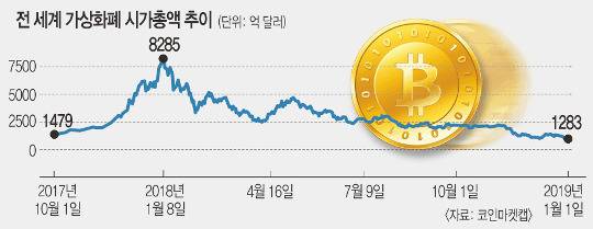 가상화폐 시황중계사이트 코인마켓캡에 따르면 세계 가상화폐의 시가총액은 지난해 1월 8일 8285억 달러(약 925조원)에서 올해 첫날인 1일 1283억 달러(143조원)로 84.5%나 감소했다. 뒤늦게 뛰어든 투자자들은 손해만 보고, 초기에 보유했던 ‘큰손’들만 차익을 챙긴 셈이다.