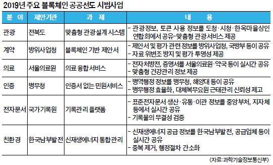 정부도 올해 각종 블록체인 시범사업에 뛰어든다. 공공기관, 지방자치단체에서 예산 85억원을 들여 블록체인 기반 맞춤형 관광, 의료 서비스 시스템 등 12개 과제를 진행한다. 다만 글로벌 블록체인 기술을 선도할 표준 플랫폼 개발보다는 응용 기술에 변죽을 울리고 있다는 비판이 제기된다.