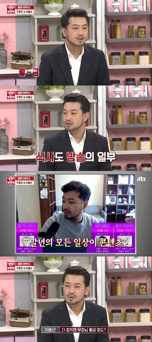 이말년은 이날 자신의 인터넷 방송에 대해서도 소개했다. 이말년은 “원래는 하고 싶을 때만 했었다. 그게 5년째다. 밥도 그냥 켜놓고 먹는다. 라이브 방송이 30만명이고, 유튜브는 45만명이다”라며 “‘신과 함께’는 못 잡는다. 다 합치면 부장님 월급 정도다”라며 억대 연봉을 공개했다.