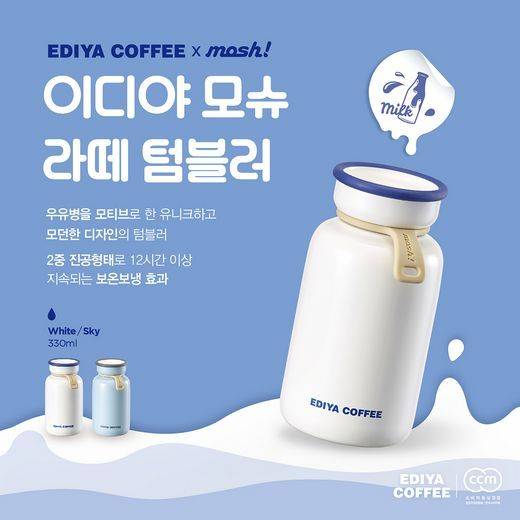 ‘이디야 모슈 라떼 텀블러’는 언제 어디서나 간편하게 휴대할 수 있는 330ml 용량의 크기로 심플한 배색과 우유병 모양의 깔끔한 디자인으로 인기를 얻고 있는 모슈의 디자인을 재현했다. 색상은 파스텔톤의 흰색과 하늘색 두 종류로 4천개 한정 판매하며 가격은 3만 원이다.