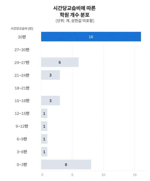 그럼 강남 서초 지역에서 가장 비싼 진학 지도 학원은 시간당 얼마를 받을까요? 서울 내 40개 컨설팅 학원 중 16개 학원의 시간당 교습비가 30만원입니다. 16개 학원의 시간당 교습비가 30만원으로 똑같으면서 동시에 가장 비싼 것으로 뉴스래빗 분석 결과 확인됐습니다.