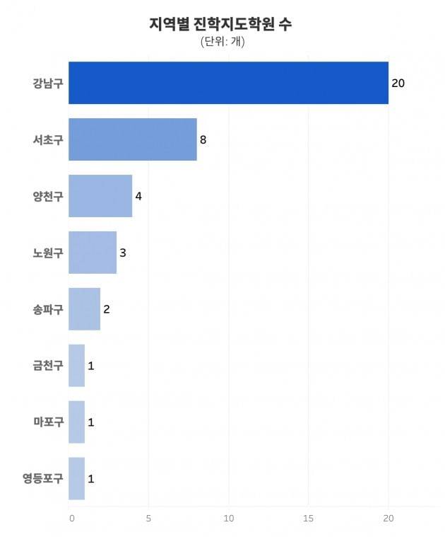 40개의 입실컨설팅 학원 중 70%인 28개가 강남·서초구에 몰려있습니다. 동네별로 살펴보면, 강남구 대치동에 16개, 서초구 서초동 4개, 양천구 목동 4개, 노원구 중계동 3개 등 서울에서 학원가로 유명한 동네에 밀집되어 있습니다.