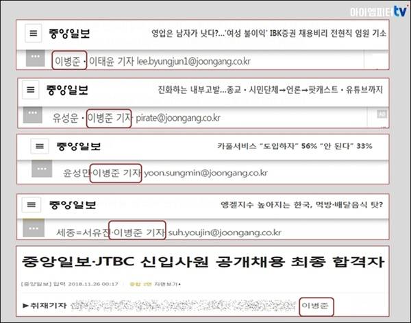 이후 이병준 기자는 <중앙일보> 유성운, 윤성민, 서유진 기자와 함께 공동으로 기사를 올립니다. 이번에 문제가 됐던 기사에 등장했던 이태윤 기자와도 2019년 1월 28일 '영업은 남자가 낫다?…'여성 불이익' IBK증권 채용비리 전현직 임원 기소' 바이라인에 함께 나왔습니다.