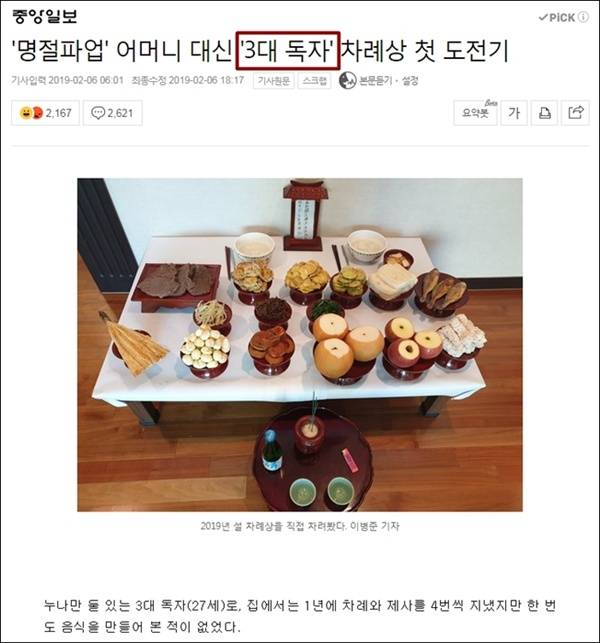 | ▲ 2월 6일 중앙일보 온라인판에 보도된 '명절파업 어머니 대신 3대 독자 차례상 첫 도전기' 기사 |