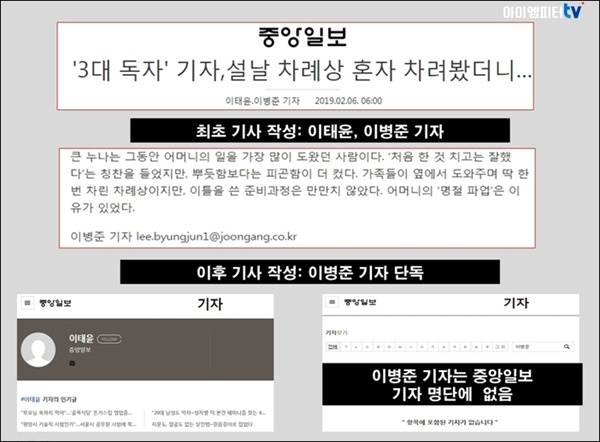 | ▲ 최초 기사가 올라왔던 포털 기사 바이라인에는 이태윤, 이병준 기자 공동으로 나왔다. 이후 이병준 기자 단독으로 바이라인이 붙었다. 이태윤 기자는 중앙일보 기자 명단에 있지만, 이병준 기자는 명단에 없었다. |