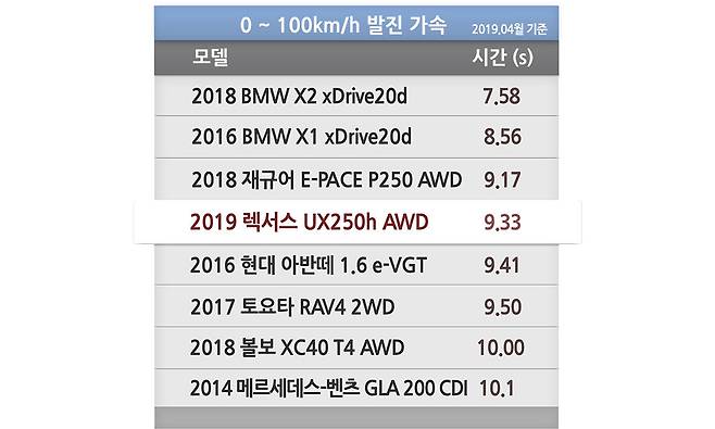 여기서 잠시 우리 팀이 측정한 동급 모델들의 무게를 보자. 우선 이번 테스트한 UX 250h AWD의 무게는 1645 kg이었다. 메르세데스-벤츠 GLA 200CDI가 1581 kg, 볼보 XC40 T4는 1734 kg, 재규어 E-PACE P250이 1868 kg이었으니 가벼운 편이다. 특히나 전기 모터, 배터리 무게도 상당한 편인데, 의외로 무게 방어를 잘했다.