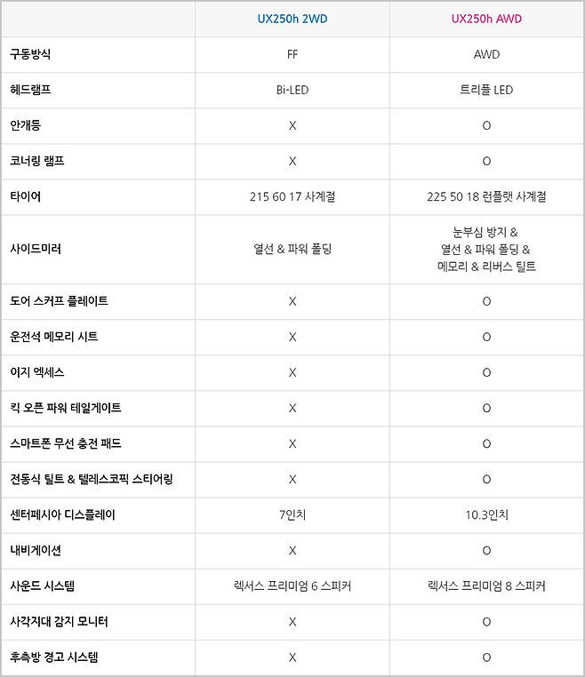 현재 팔리는 UX는 2개 트림으로 나뉜다. 2륜과 AWD 모델이다. AWD 트림은 후륜에 5.4마력의 전기모터가 추가돼 미끄러운 노면 등에서 안정성이 높아진다.