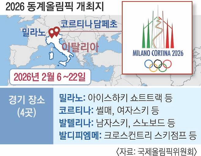 이탈리아는 밀라노와 코르티나담페초를 공동 개최도시로 내세워 일찌감치 동계올림픽 유치전에 뛰어들었다. 아이스하키와 쇼트트랙, 피겨스케이팅은 밀라노에서 열리고 썰매·여자 알파인스키 등 대부분의 설상종목은 코르티나담페초에서 치러진다. 토마스 바흐 IOC 위원장은 “전통적인 동계 스포츠의 나라에서 훌륭하고 지속가능한 올림픽 경기들이 열리게 되기를 기대한다”고 말했다.