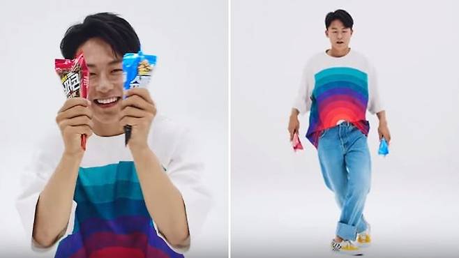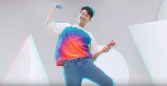 이승우 선수는 광고에서 손 선수가 입었던 옷도 그대로 착용한 채 양손에 슈퍼콘을 들고 발랄한 댄스를 선보였습니다.