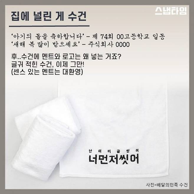 '새해 복 많이 받으세요- 주식회사 OOO' 선물용 수건에는 특정 글귀와 선물하는 단체·회사의 이름, 로고가 새겨져 있다. 시간이 지나 이따금 수건에 처음 보는 이름을 발견할 때면 '굳이 넣을 필요가 있었을까'라는 의문이 들기도 한다.