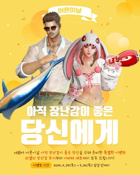 '마비노기 영웅전'에서는 5월16일까지 게임 내 일일미션을 달성하거나 30레벨 이상 일반전투 완수 시 '[2019 어린이날 기념 쿠폰]'을 지급한다. 쿠폰을 모으면 전용 상점을 통해 '봄꽃 어린이 세트', '질풍의 레이서 세트', '리엘의 장난감 무기 선택 상자' 등 다양한 게임 아이템으로 교환할 수 있다.
