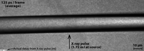 우선 연구팀은 물에 강한 압력을 가해 폭이 14–30 마이크로미터에 불과한 고속 마이크로 제트 형태로 분사했다. 강한 압력으로 물 분자를 움직이지 못하게 한 다음 X선 레이저로 강한 충격을 주기 위해서다. 마이크로 제트에 강력한 X선 레이저를 쏘면 갑작스러운 증발과 함께 충격파가 형성되면서 큰 소음이 발생한다.(사진) 비록 매우 작은 미시 세계에서 순간적으로 발생하는 일이지만, 이제까지 없었던 강력한 음파를 만든 것이다.