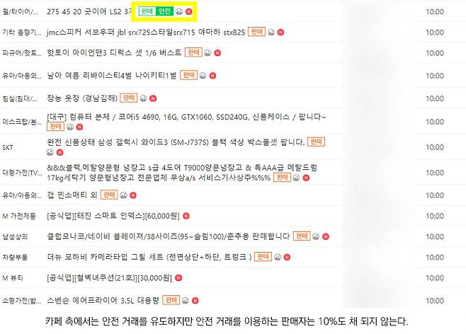 특별한 경우가 아닌 이상 주로 택배 거래를 이용한다. 카페 측은 더치트 번호 제공, 네이버페이를 사용한 안전결제, 안심 번호 사용 등을 유도하지만 안전결제를 하는 판매자 비율이 10%도 되지 않아 구매자가 각별히 신경써야 한다는 단점이 있다. 하지만 중고나라만큼 물품이 많고 활발하게 거래가 일어나는 곳은 없기 때문에 중고 거래를 원할 때 빼놓을 수 없는 곳이다.