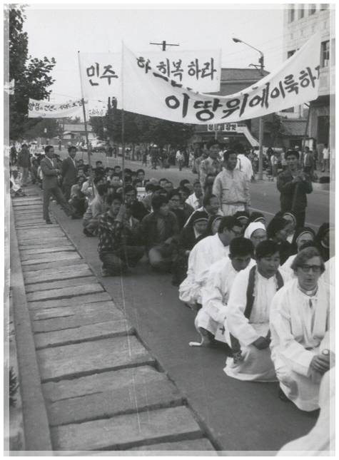 | ▲ 1974년 지학순 주교가 민청학련 사건에 연루돼 구속됐다. 이에 전국의 가톨릭 사제와 신도들이 원주 원동성당에 모여 정부규탄과 지 주교 석방을 촉구하는 가두행진을 진행했다. "민주 헌정 회복하라" 구호가 적힌 현수막이 보인다. |